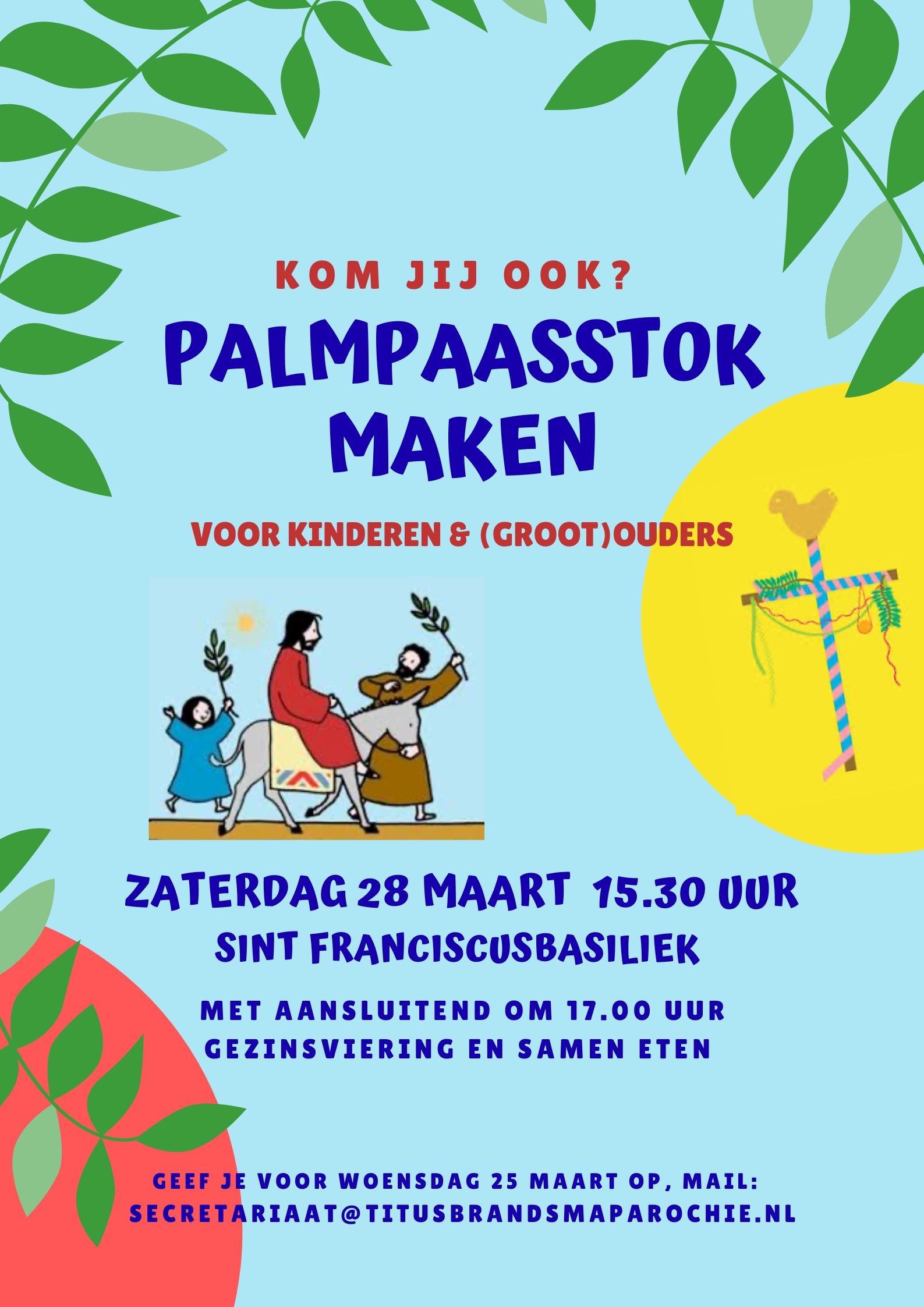 Opgave voor het Palmpaasstok maken kan via een mail naar het secretariaat (Dit e-mailadres wordt beveiligd tegen spambots. JavaScript dient ingeschakeld te zijn om het te bekijken.), dit kan tot woensdag 25 maart.