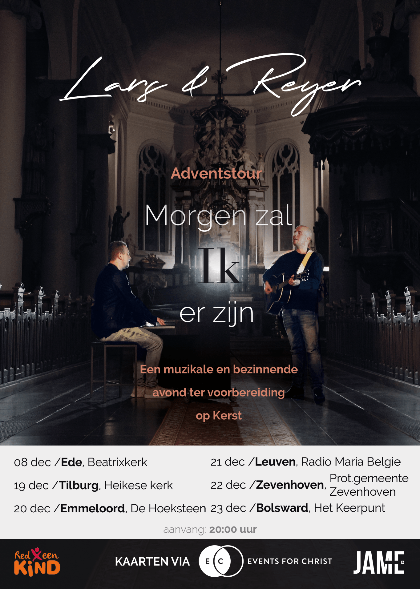 Samen schreven ze, ter gelegenheid van de aanstaande Advenstour, het nieuwe lied Morgen zal Ik er zijn. “Het lied is geïnspireerd op de O-Antifonen die we bidden in de dagen voorafgaand aan Kerst” , zegt Lars. “In tegenstelling tot het zingen over Kerst, waarbij we de geboorte van Jezus als Redder van de wereld vieren, wilden we nu bewust kiezen voor een lied over uitzien naar Zijn komst”, vult Reyer aan.